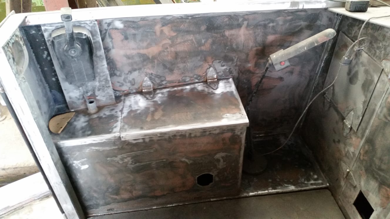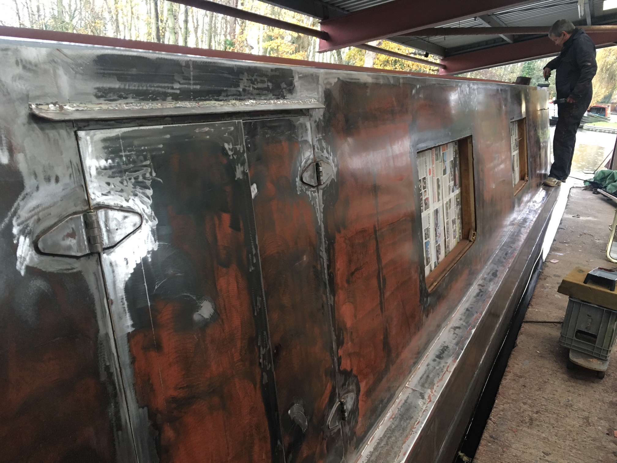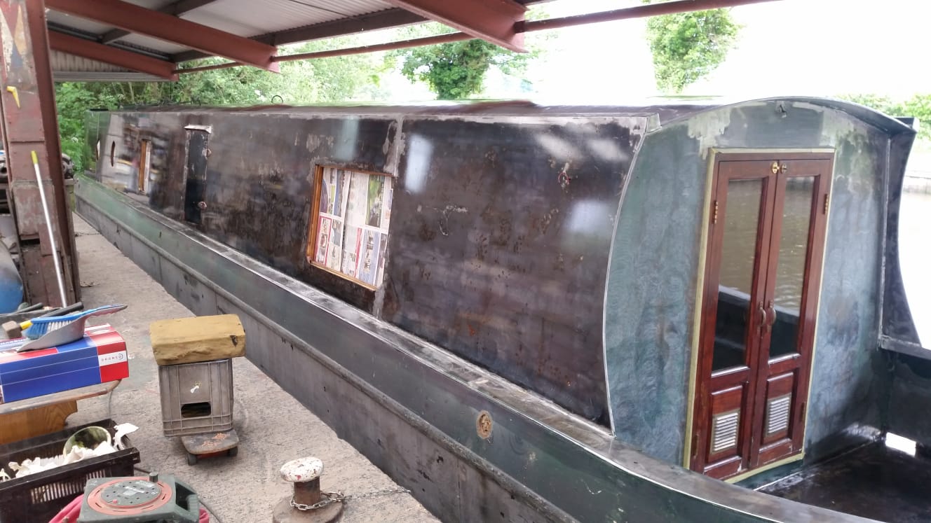 Before any work begins we remove all windows and hull fixings then we strip all painted areas back to bare metal. All steel areas that have shown rusting will have the oxidation removed, the area will then be treated before priming.